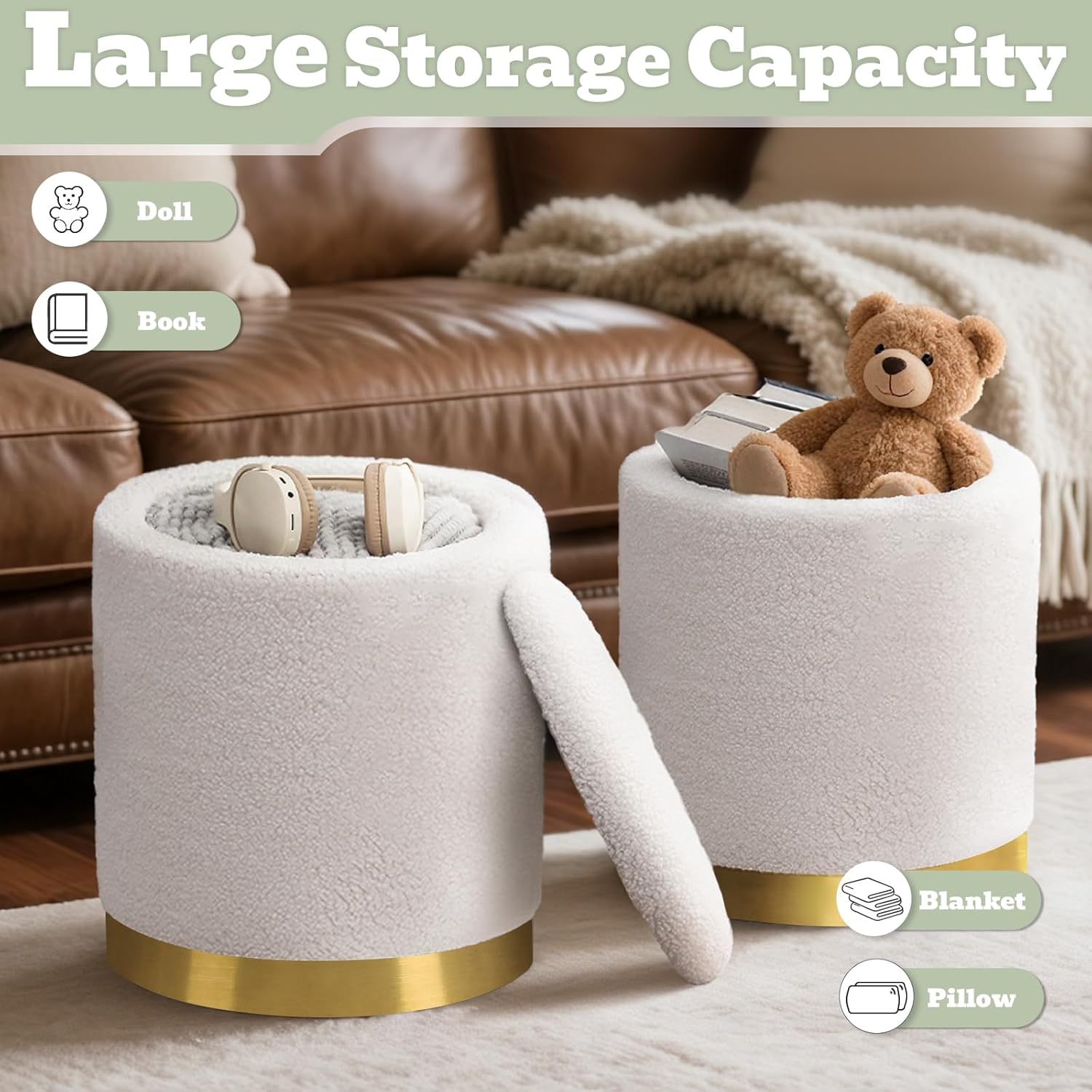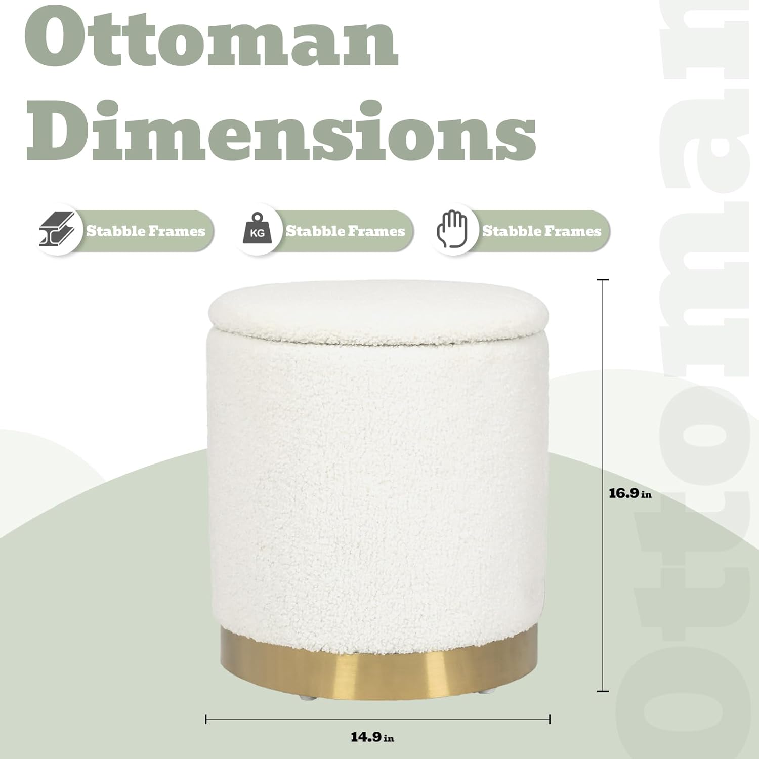 Joveco Boucle Round Storage Ottoman with Removable Lid, Small Upholstered Foot Rest Stool with Gold Plating Base, for Dorm Living Room Bedroom, White